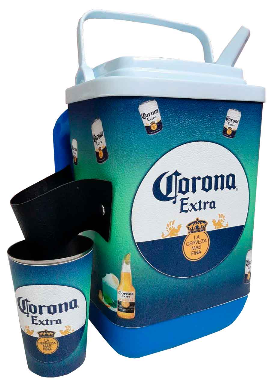 - Termolar de plástico de alta resistencia forrado con cuerina impresa con diseño de Corona